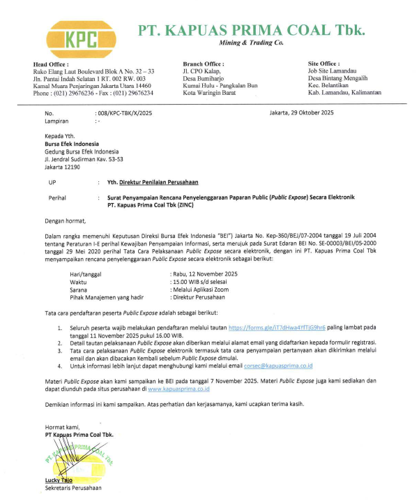 Dengan ini Direksi PT. KAPUAS PRIMA COAL Tbk (“Perseroan”) mengundang para pemegang saham Perseroan untuk menghadiri Rapat Umum Pemegang Saham Tahunan (“RUPST”) selanjutnya disebut “RAPAT”), yang akan diselenggarakan pada : Hari/tanggal : Senin, 30 Juni 2025 Pukul : 14.00 WIB – Selesai (RUPST Online melalui eASY.KSEI) Tempat : Kantor PT Kapuas Prima Coal Tbk Jl. Pantai Indah Selatan 1, Blok A 32‐33 Kamal Muara, Penjaringan Jakarta Utara A. Mata Acara RUPST: